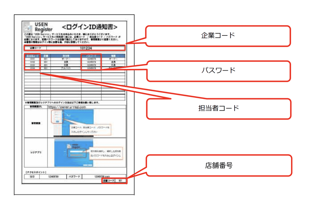 管理画面ログイン情報:ログイン企業コード、パスワード、担当者コード、店舗番号