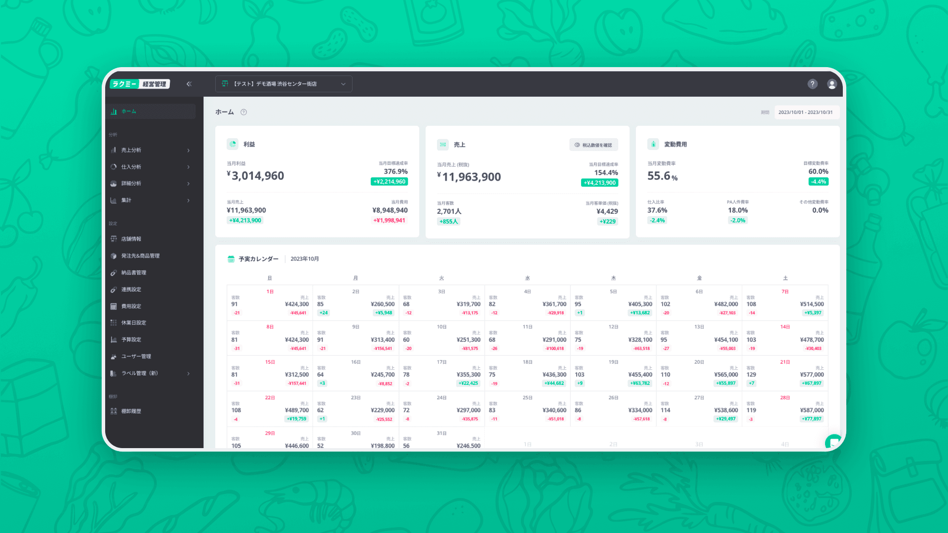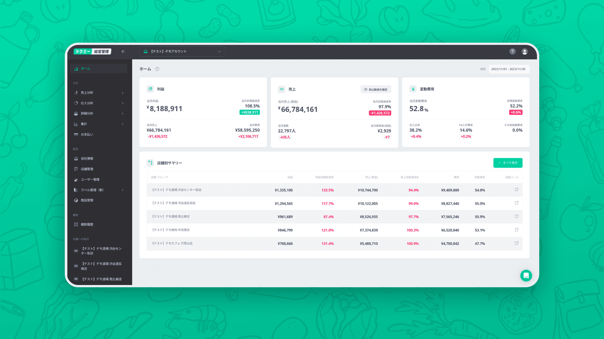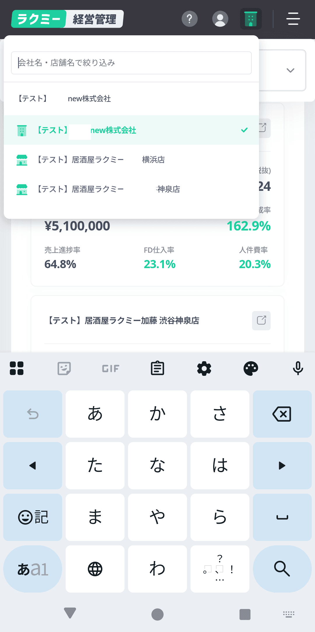 ラクミー経営管理システムのダッシュボード画面です。会社全体、各店舗ごとの重要な経営指標を確認可能です。