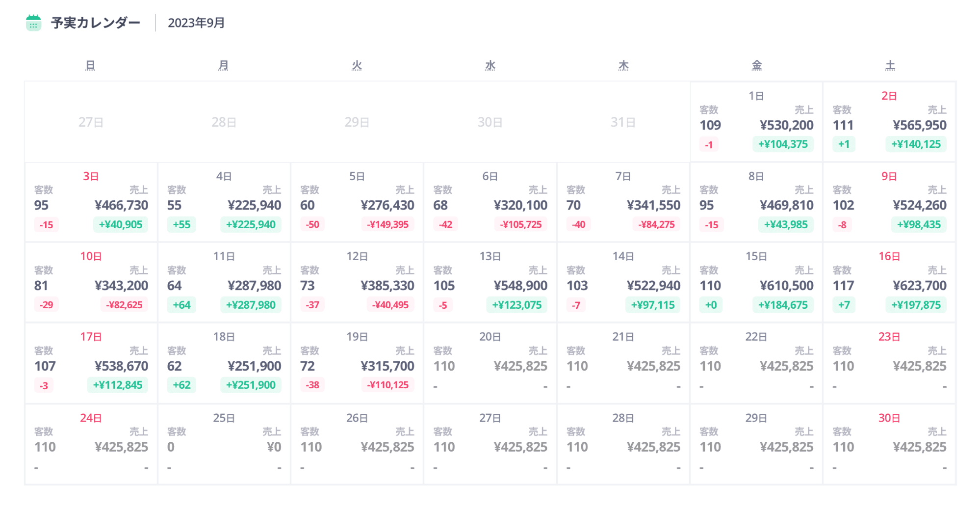 売上(税抜)達成率 | 売上(税抜) / 売上目標(指定期間の営業日数割) | |