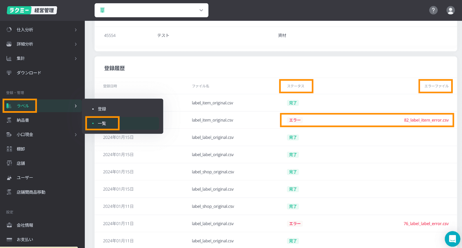 ラベル(費目・ラベル)ファイルのアップロード完了確認とエラー時の対応