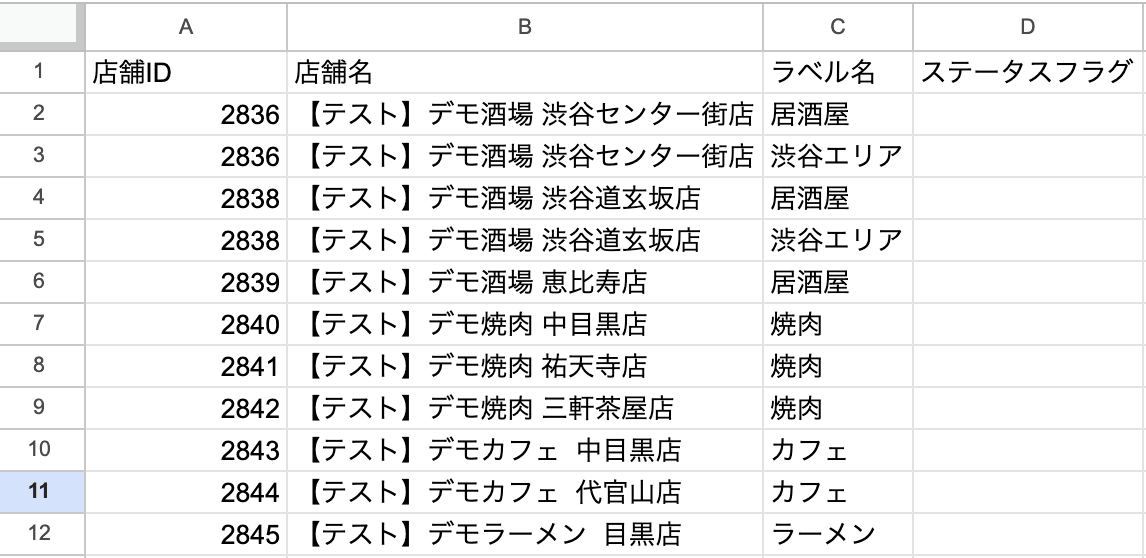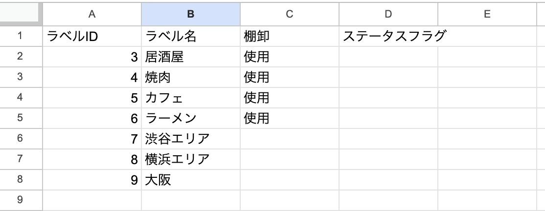 更新操作 | 店舗ID | 店舗名 | ラベル名 | ステータスフラグ |