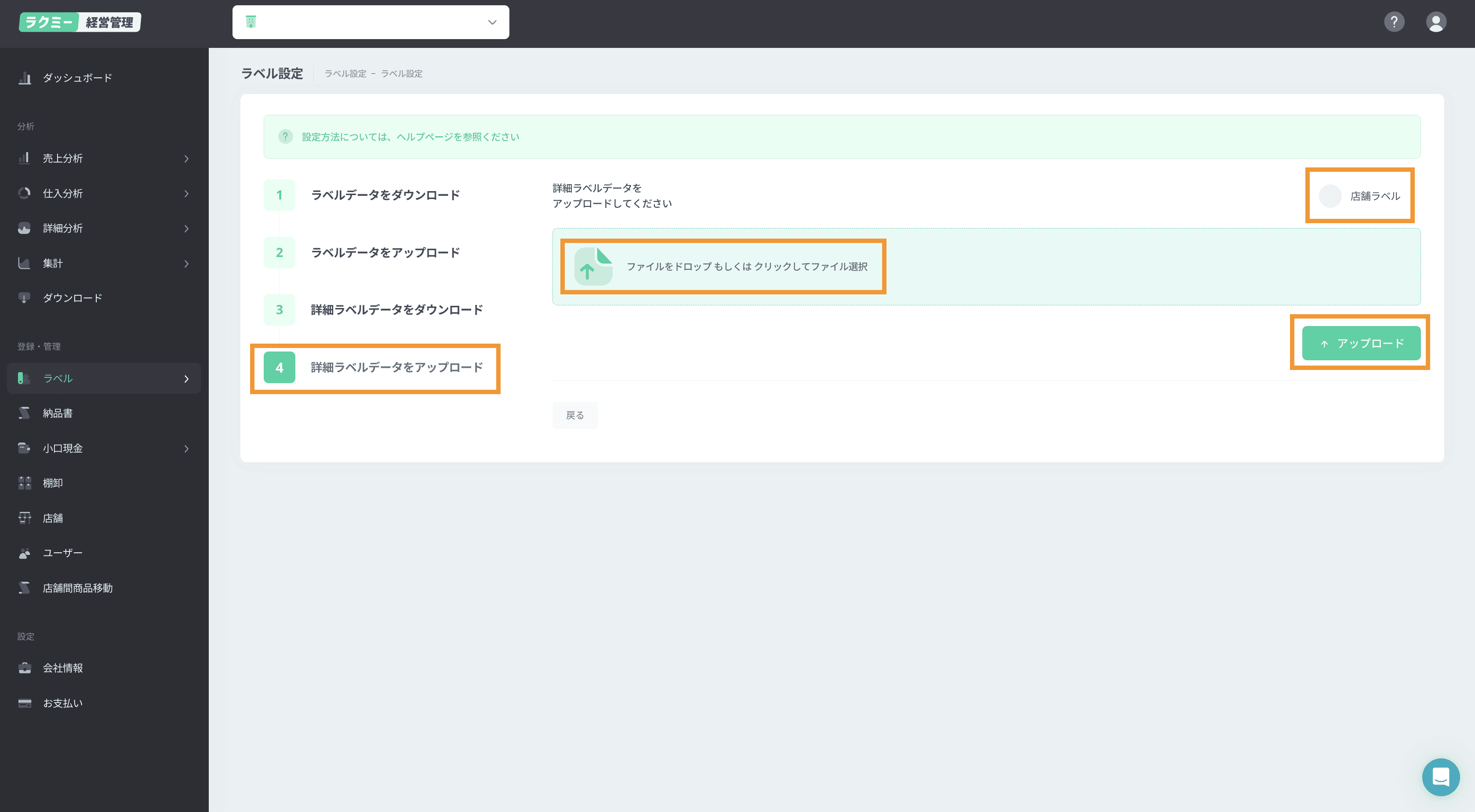 ❹詳細ラベルデータをアップロード>「店舗ラベル」を選択する