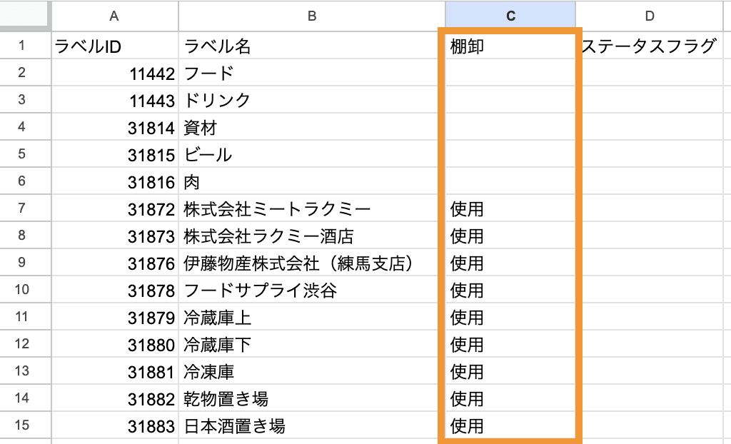実際に設定した「ラベル」を、個々の対象(仕入商品のA、店舗Bなど)に具体的に設定されたラベルです