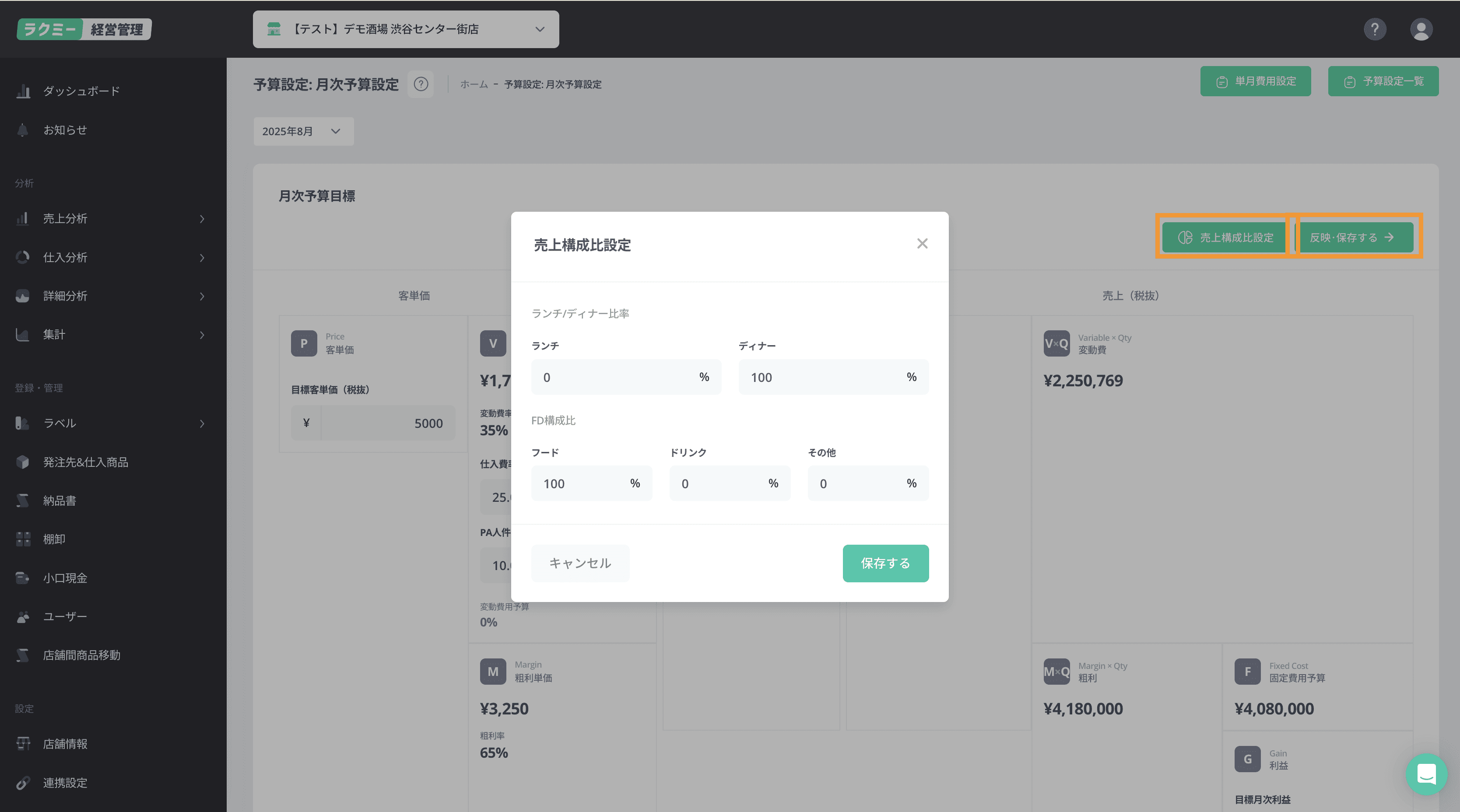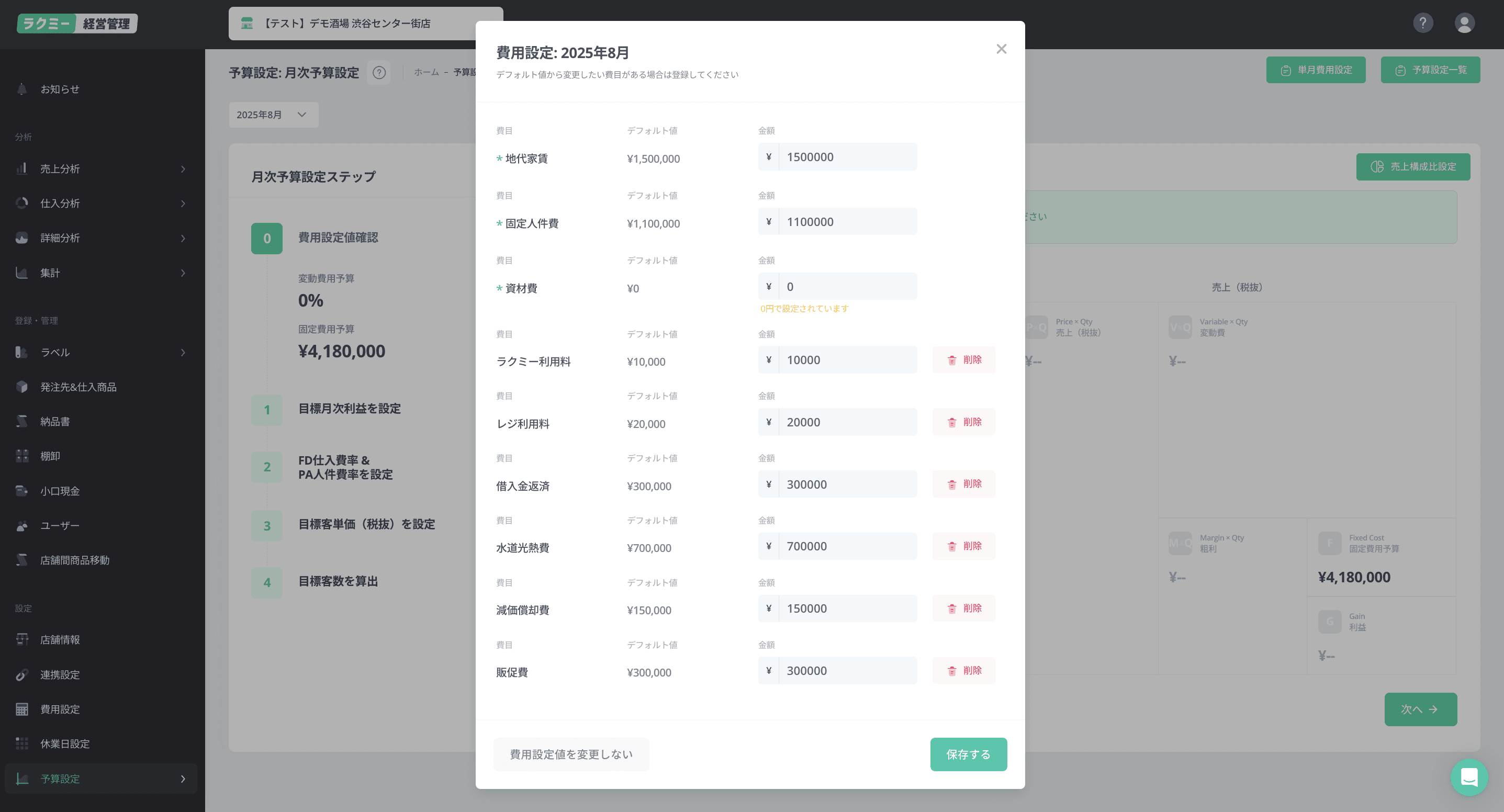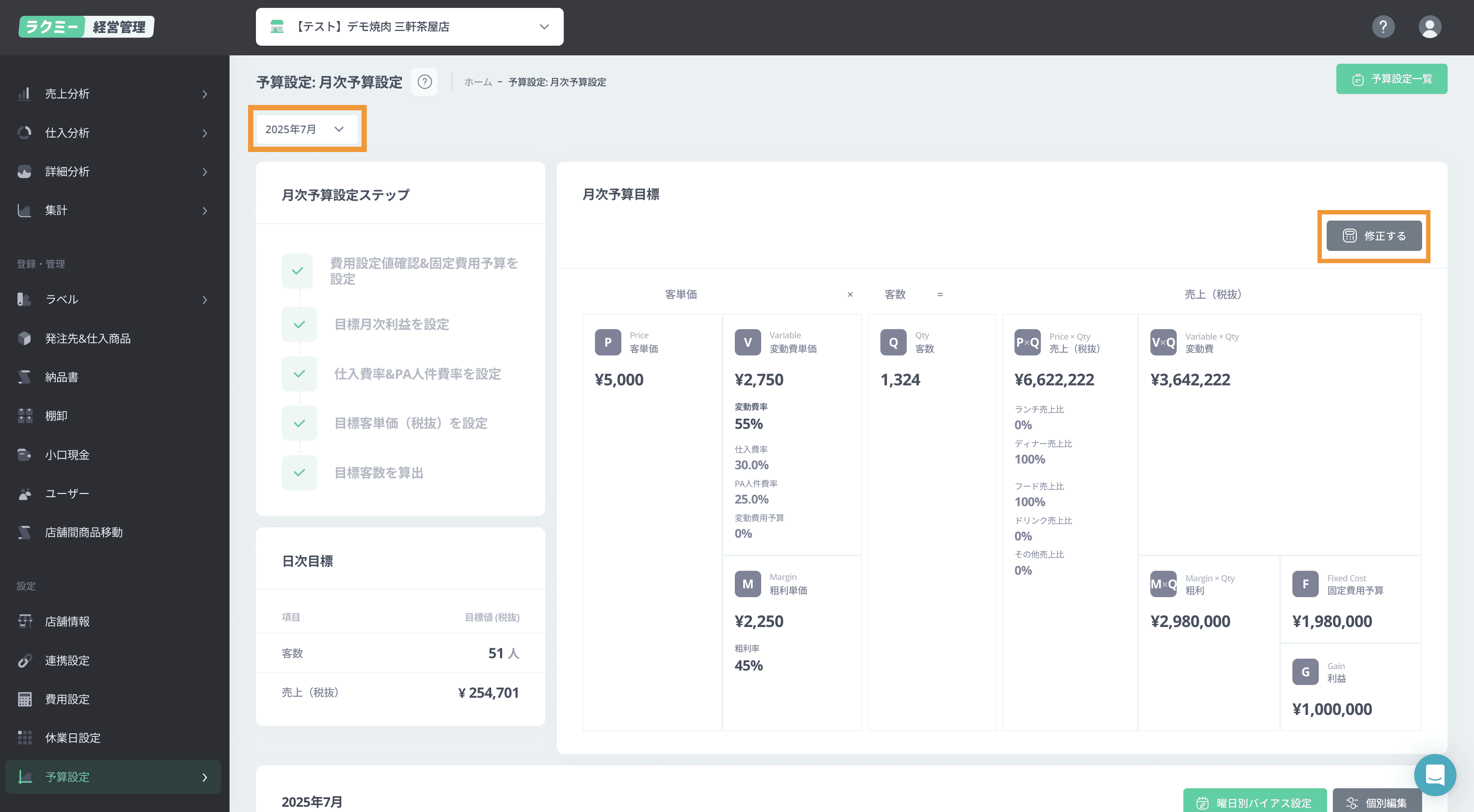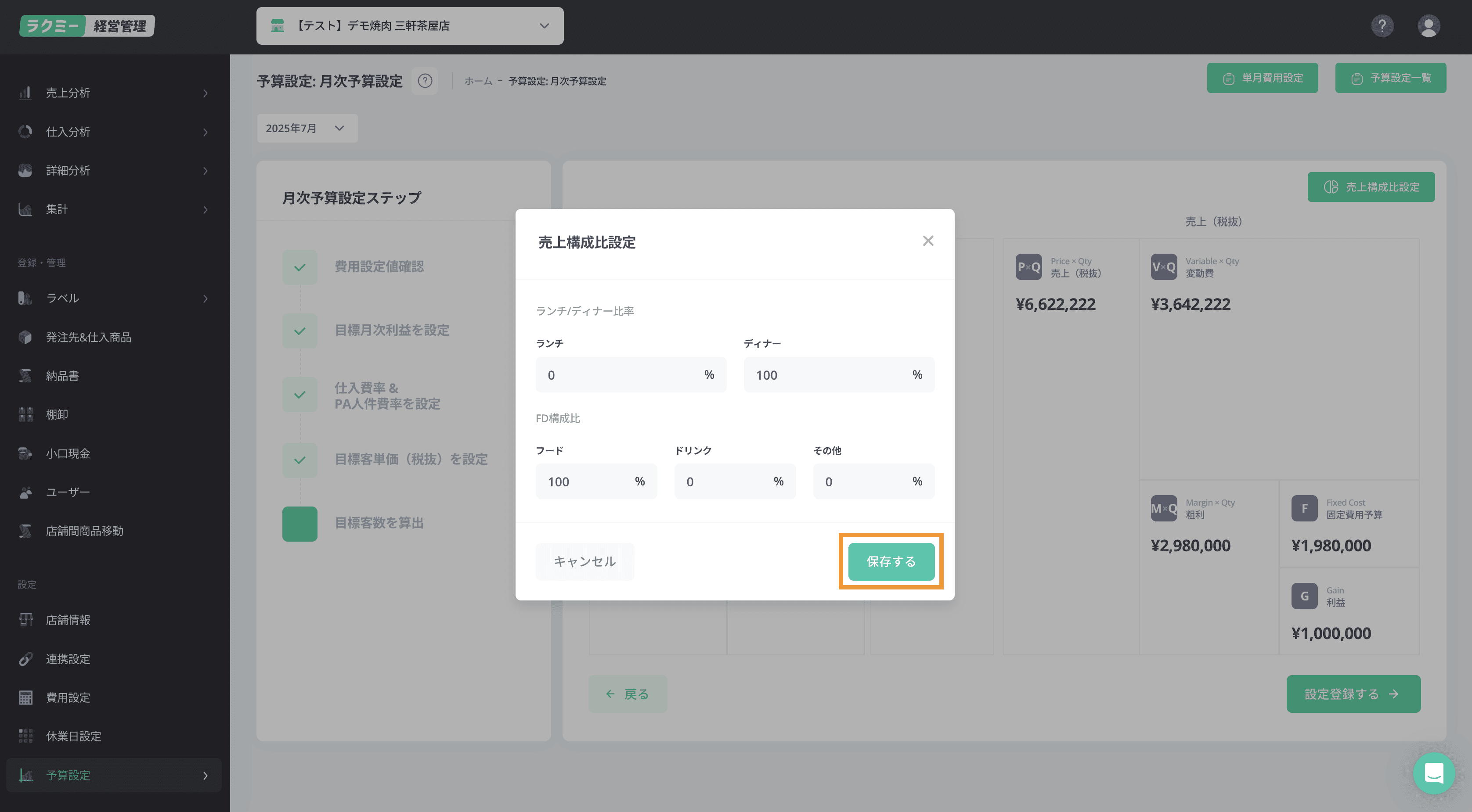 月次予算設定を入力すると自動的に目標売上・客数が算出されます