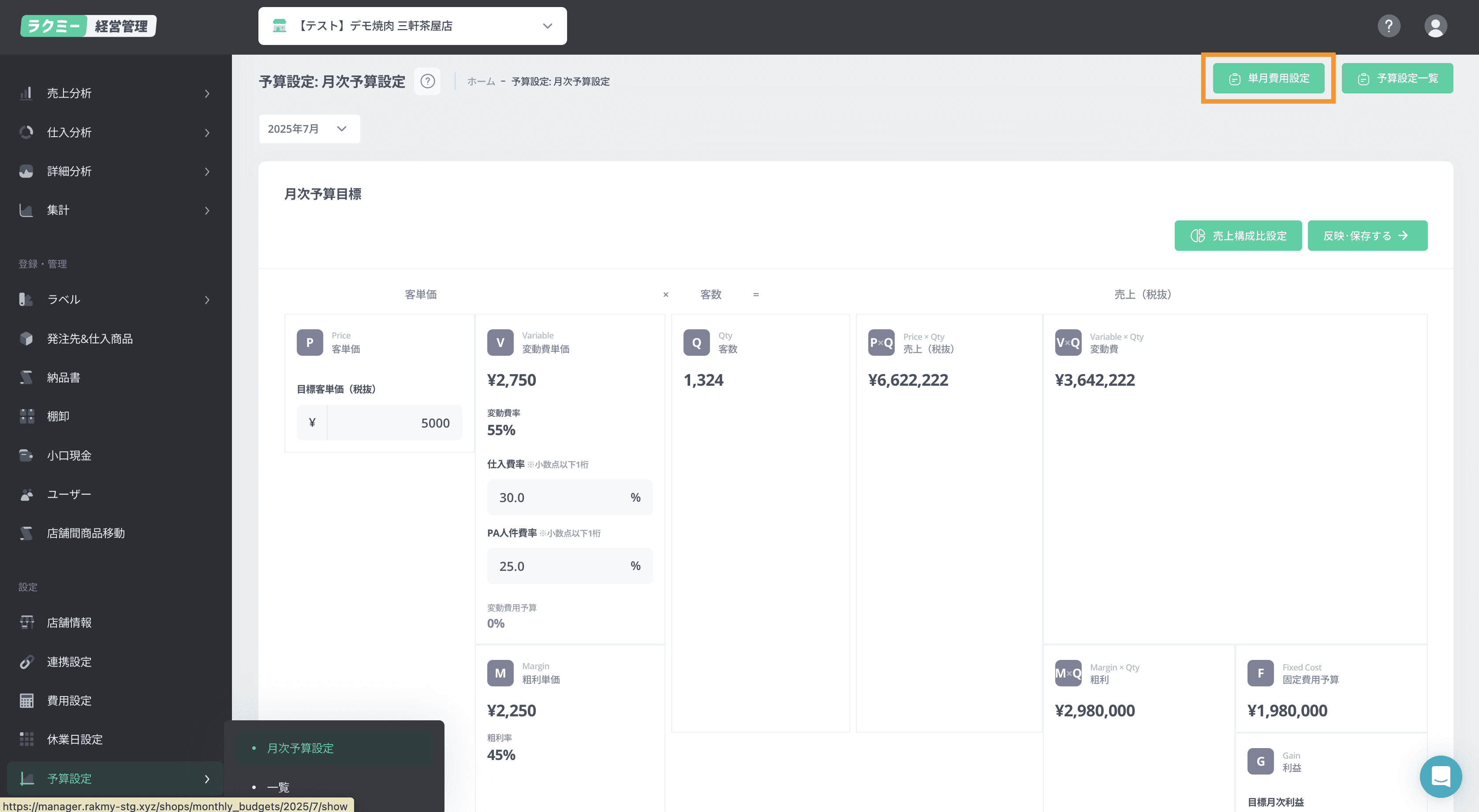 Variable | 仕入費率 | 25% | 「予算設定」より設定が可能です |