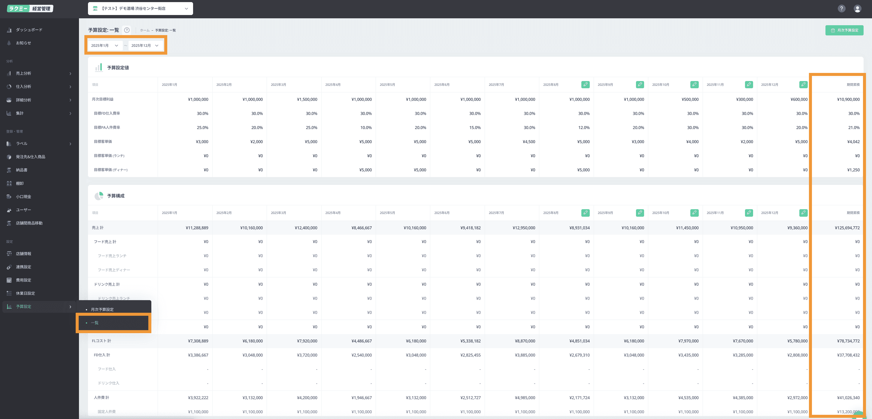 予算設定では、月次の予算設定と選択した期間で予算を一覧にて閲覧いただけます。