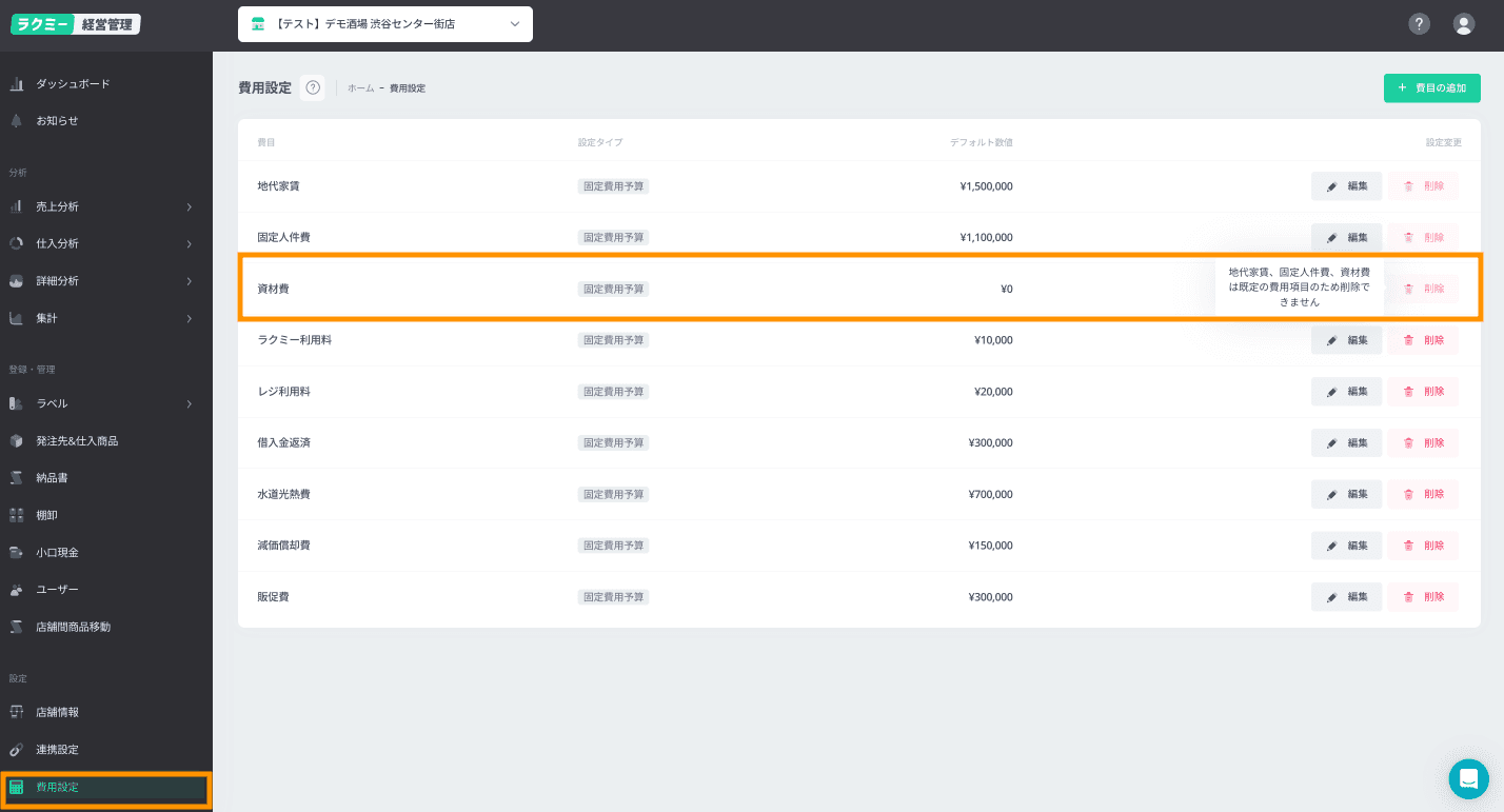 今まで「仕入費率」に含まれていた「資材(消耗品)」分は、費用設定の「資材費」に、「固定費用予算」もしくは「変動費用予算」で設定ください