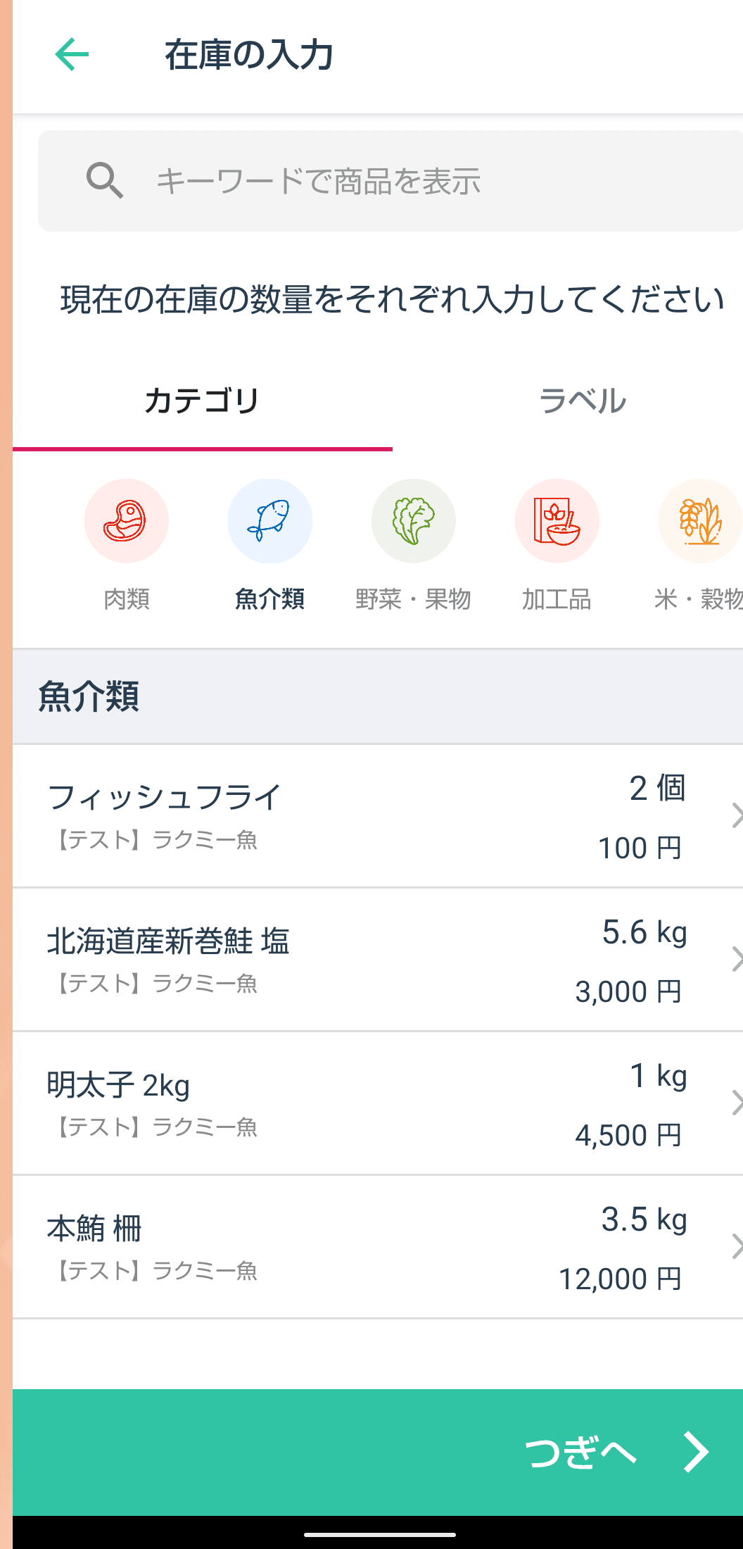 全ての商品の入力が完了したら「つぎへ」を選択する