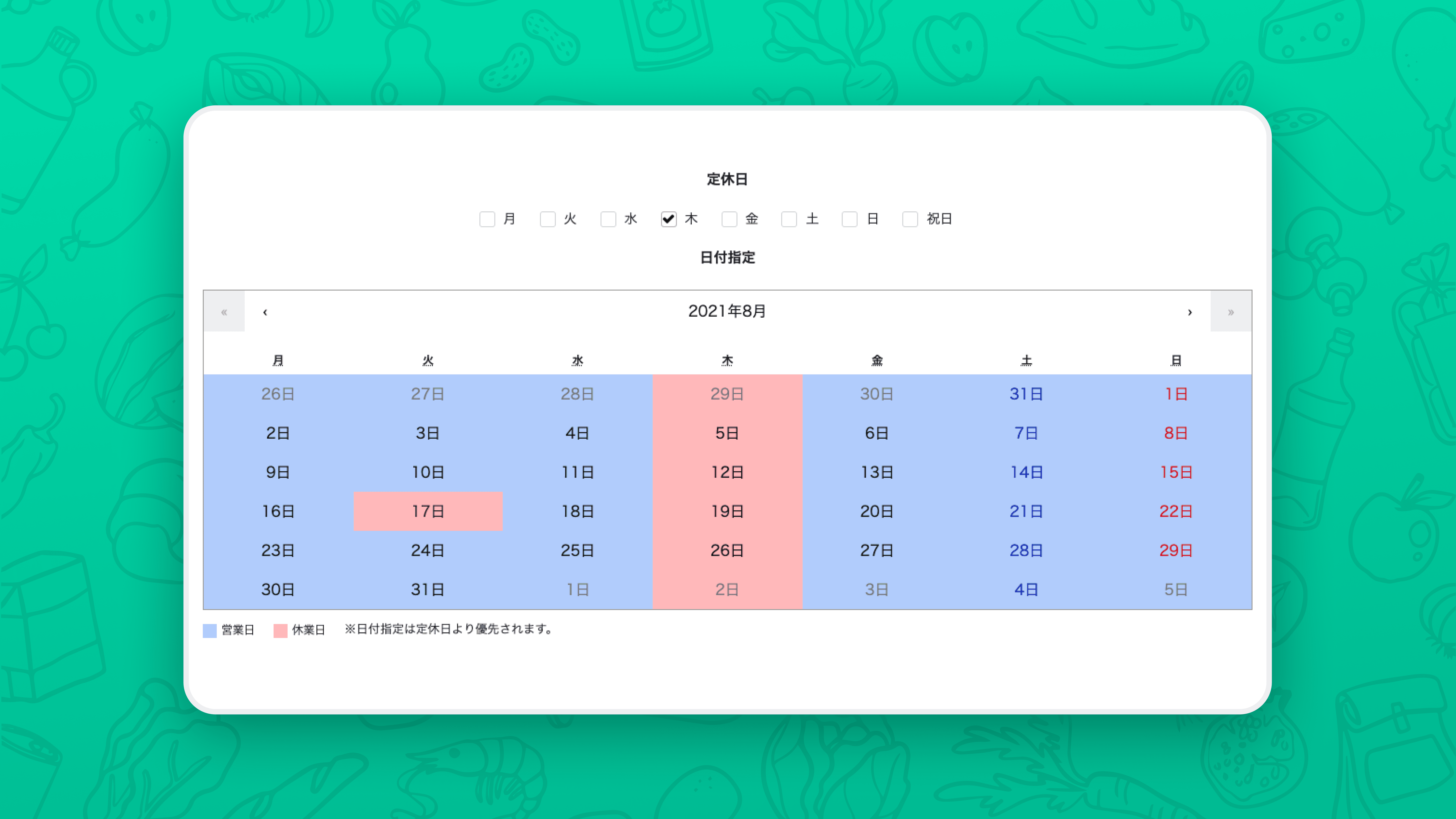 休業日は、定休日から一括で指定することもできますし、カレンダーから直接日付を選択することで、個別に指定することも可能です