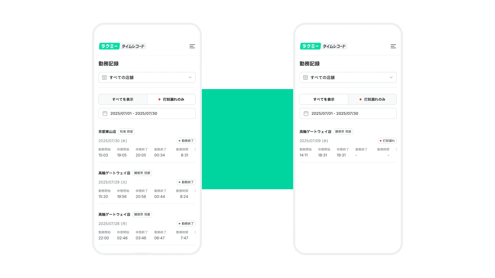 ナビゲーションメニューから「打刻記録」を選択し、「打刻漏れのみ」タブを選択すると退勤打刻記録がないもののみ表示されます。