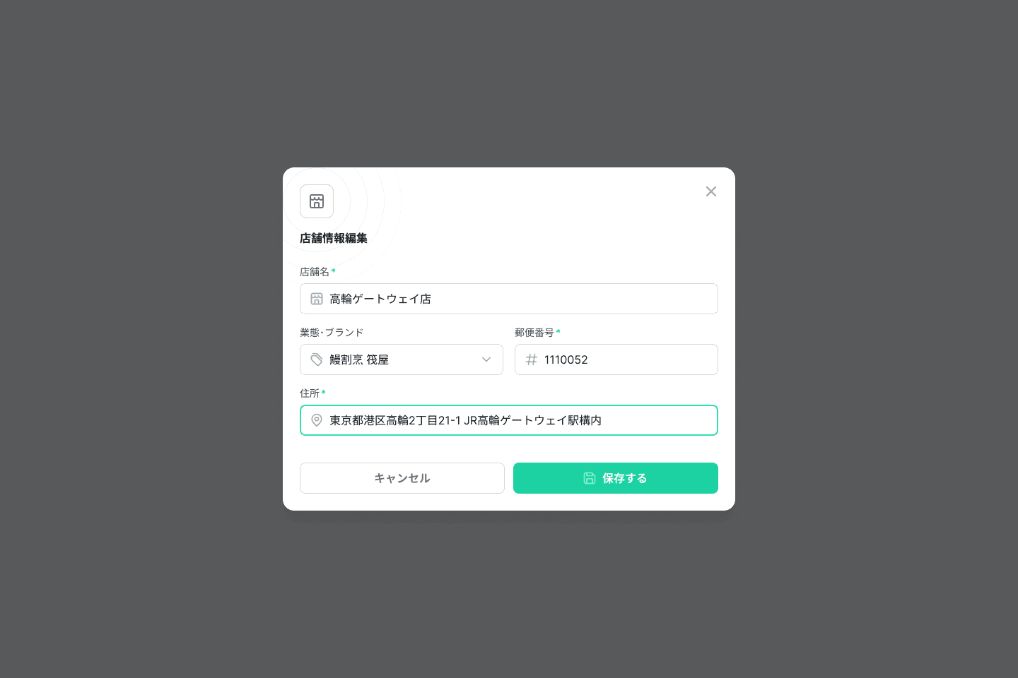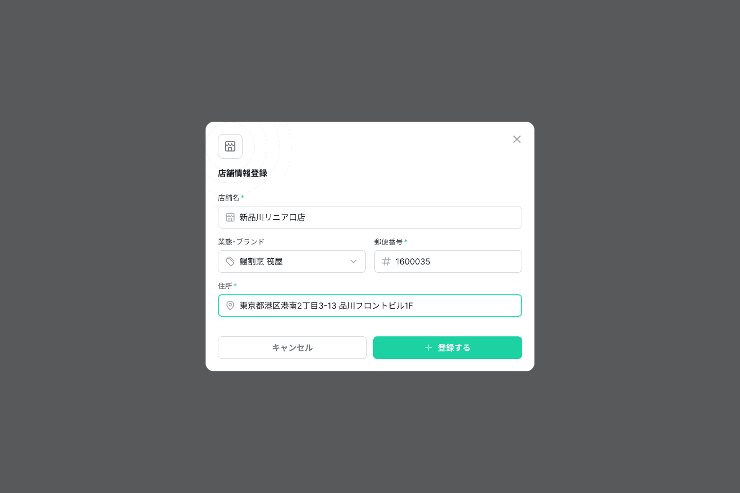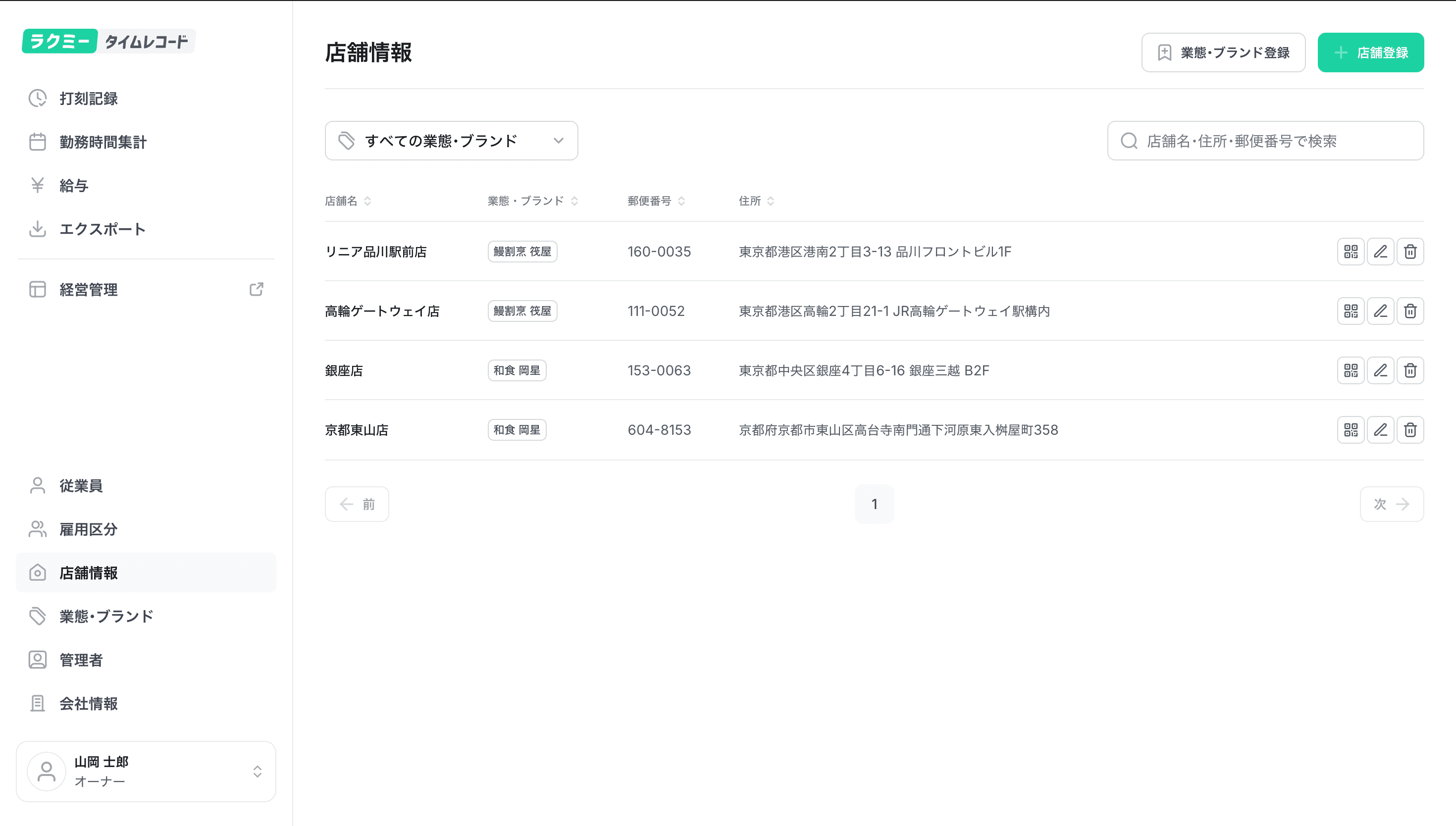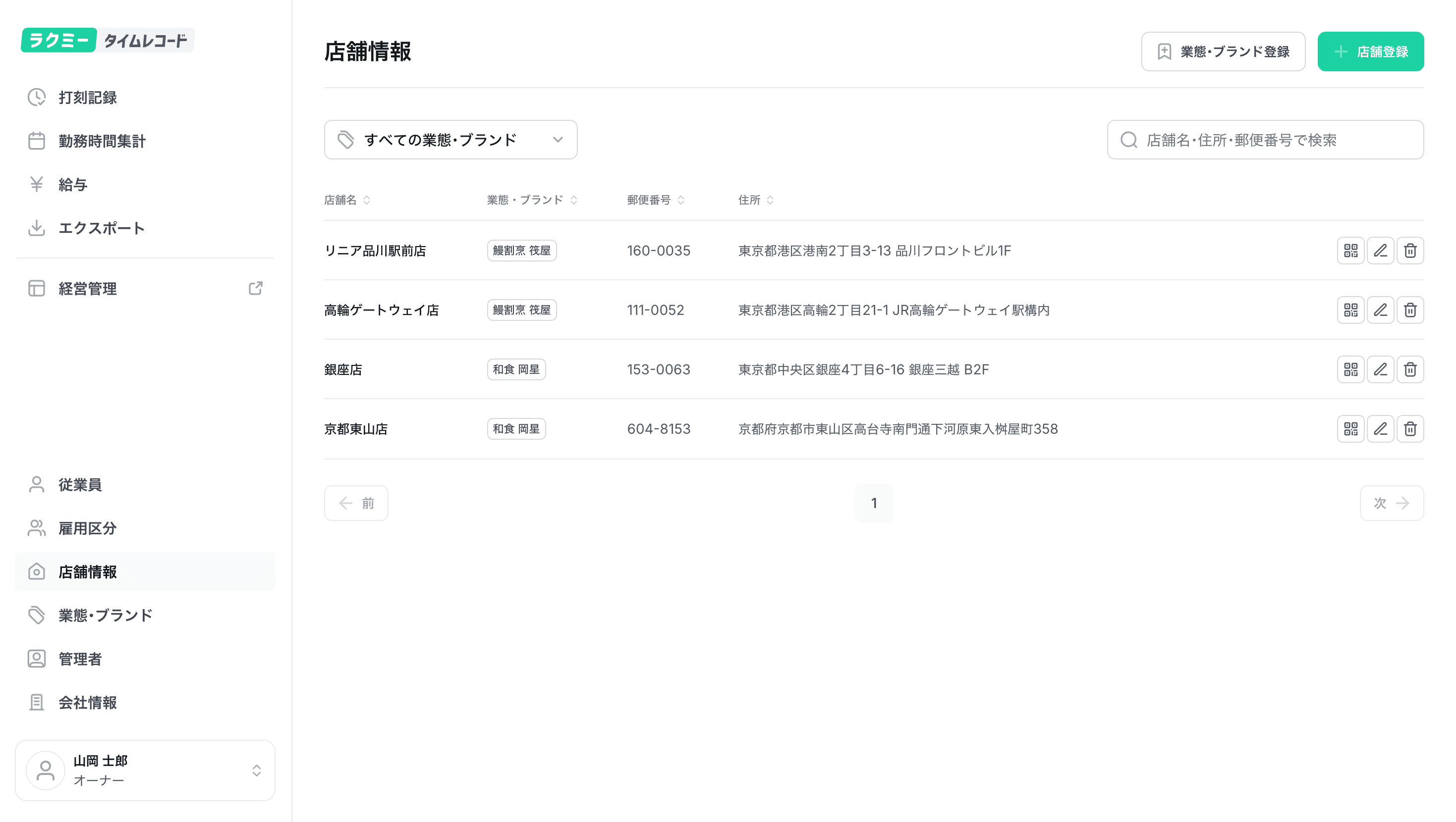 店舗情報ページにて、「店舗登録」ボタンをクリックし、店舗情報 (店舗名、業態・ブランド、郵便番号、住所)を登録
