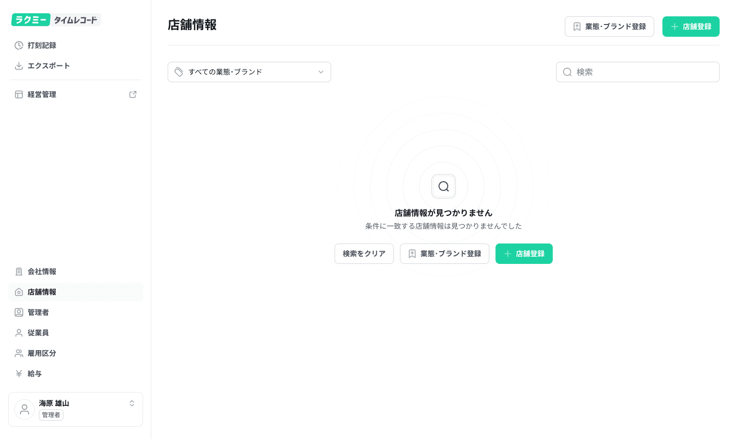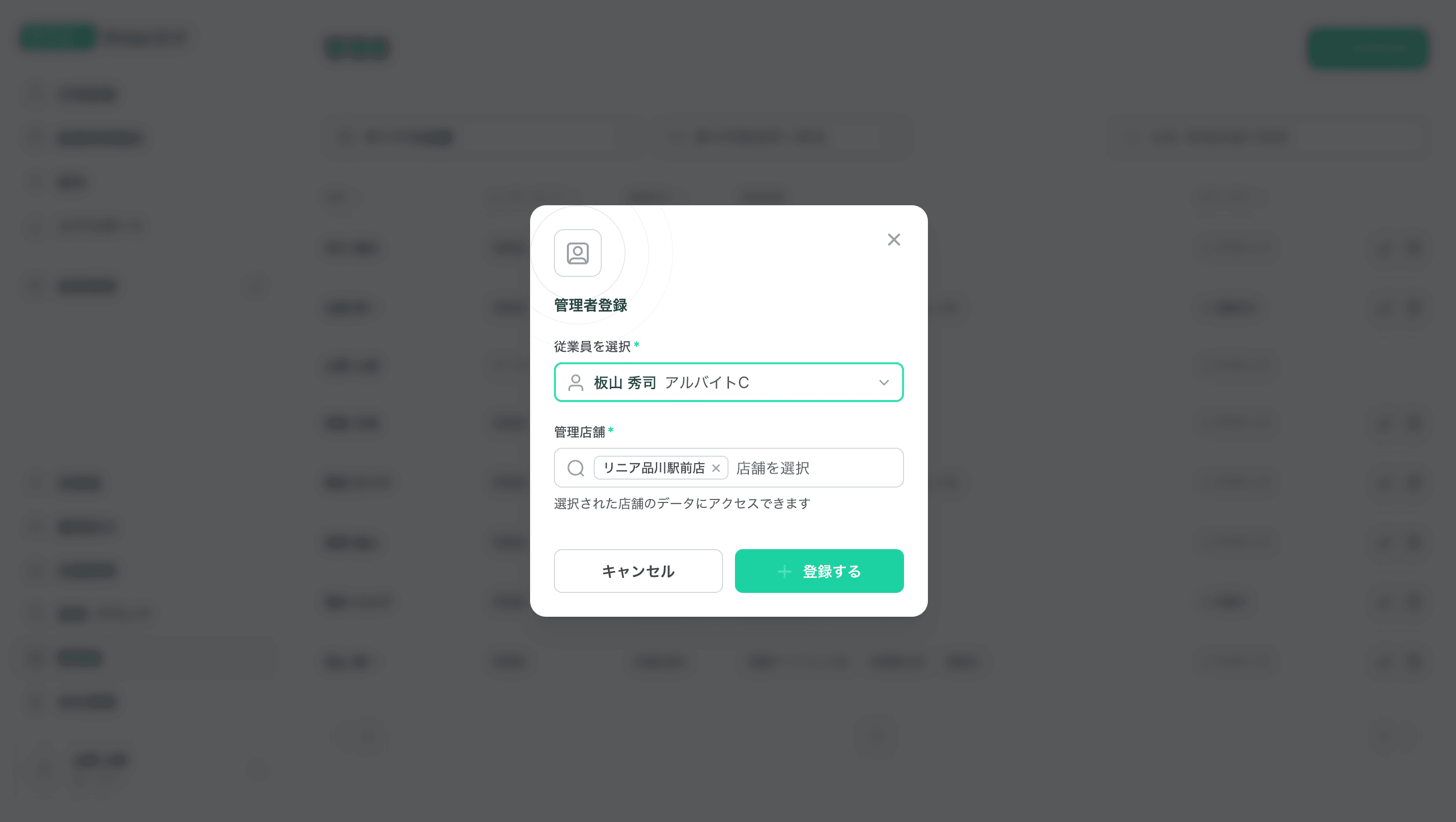 管理者ページにて、「管理者登録」ボタンをクリックし、新規に管理者として登録する従業員を選択し、管理店舗を設定 (複数選択可能)