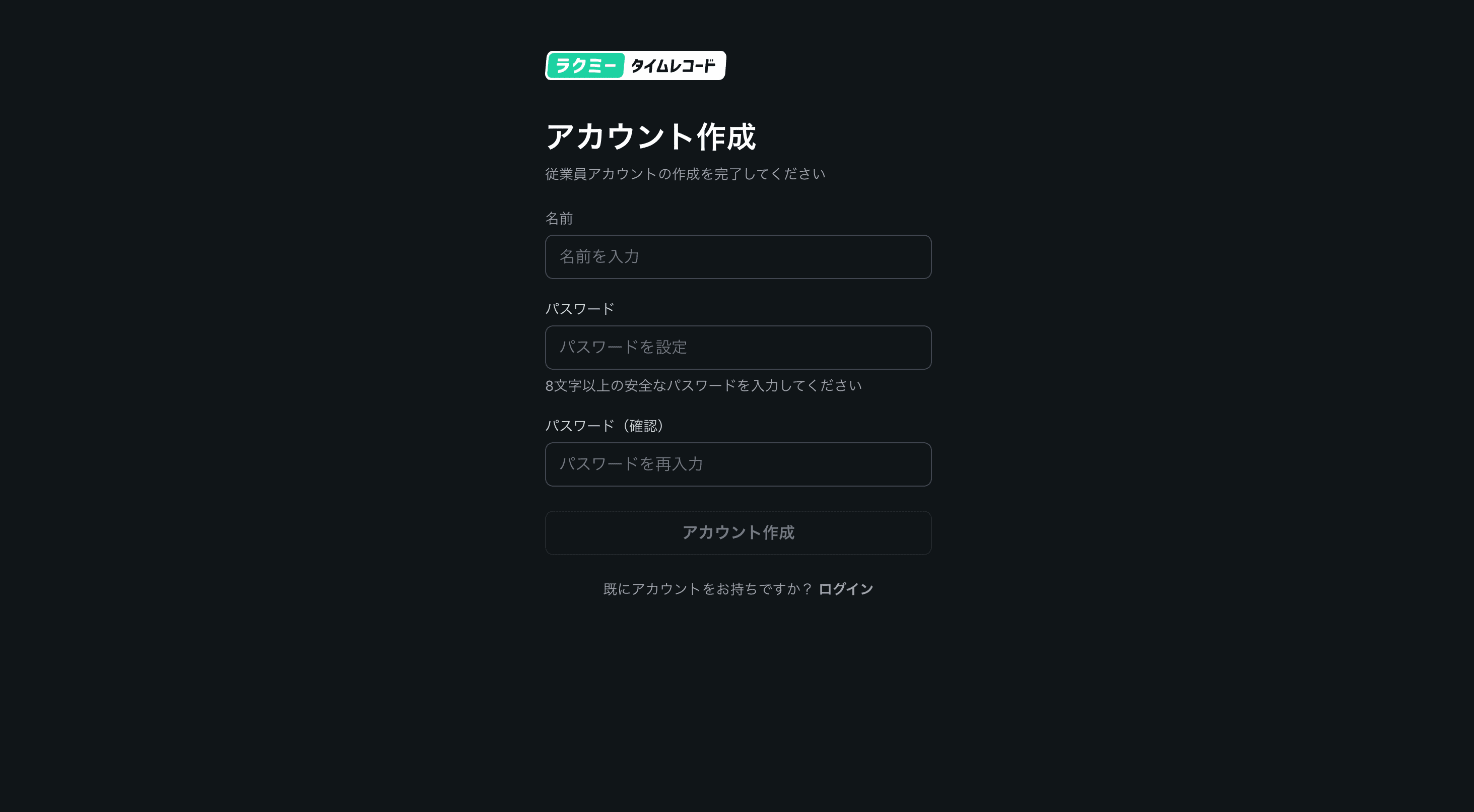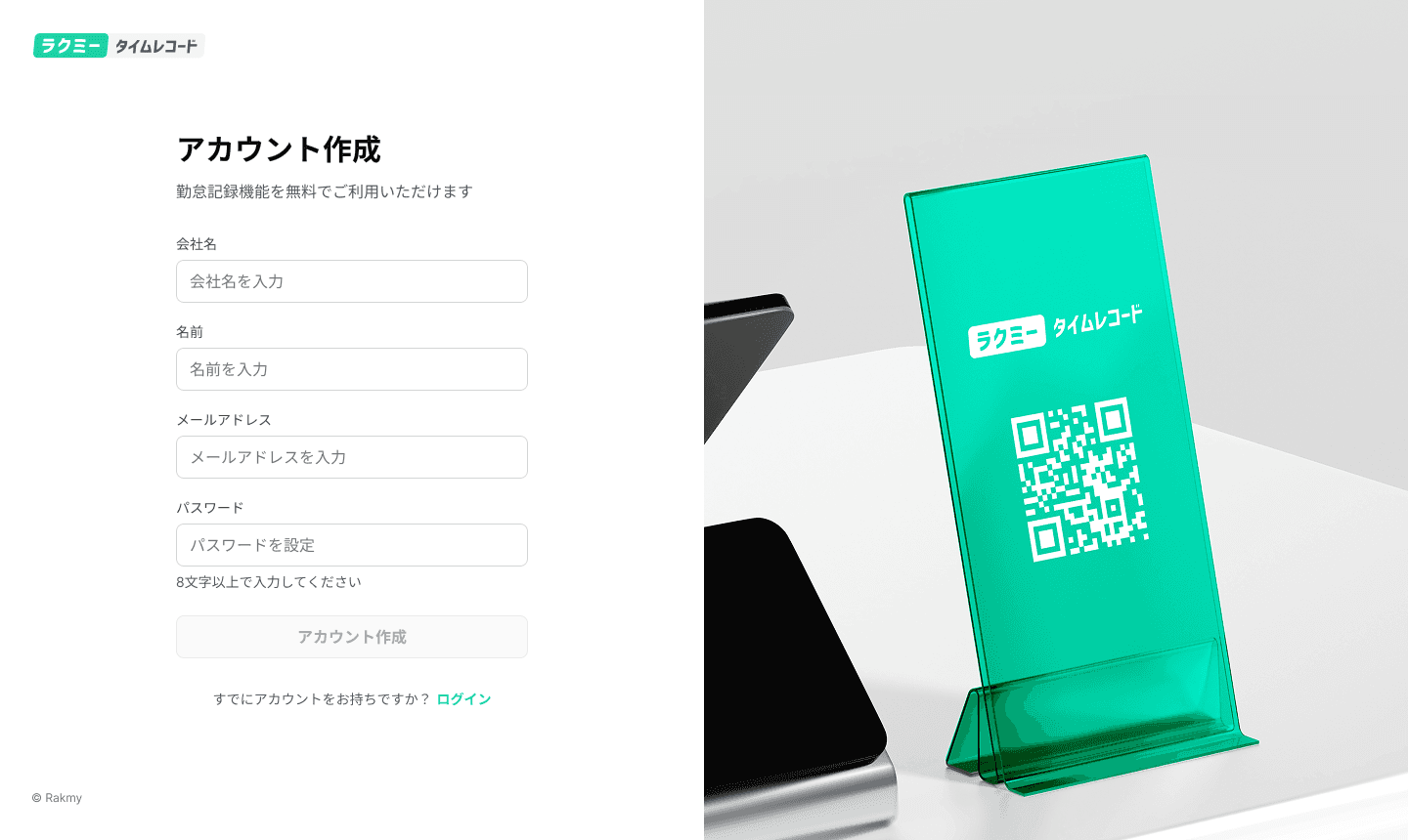 アカウント作成ページにて、会社名、名前、メールアドレス、パスワードを設定し、オーナーアカウントを作成します。