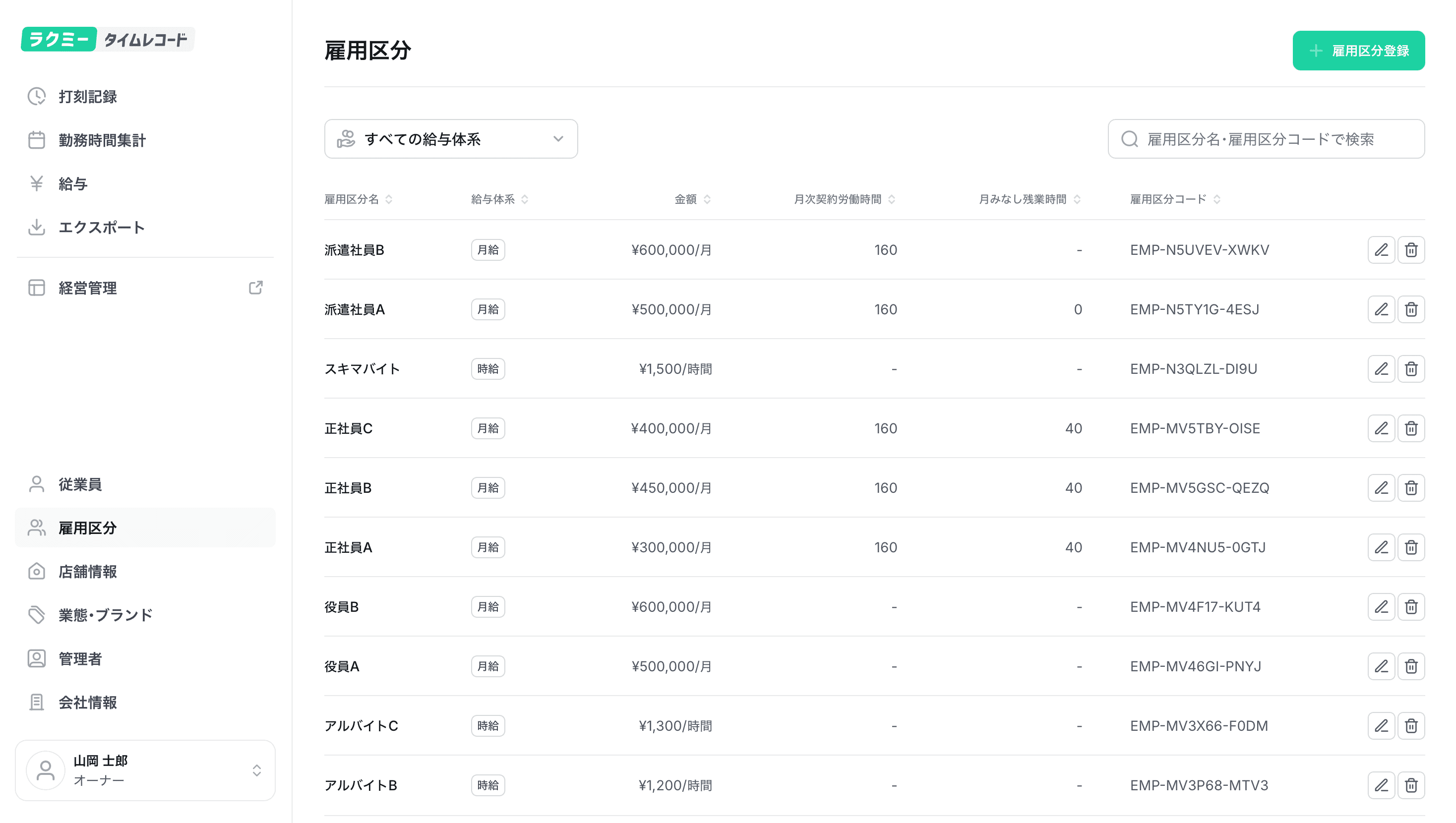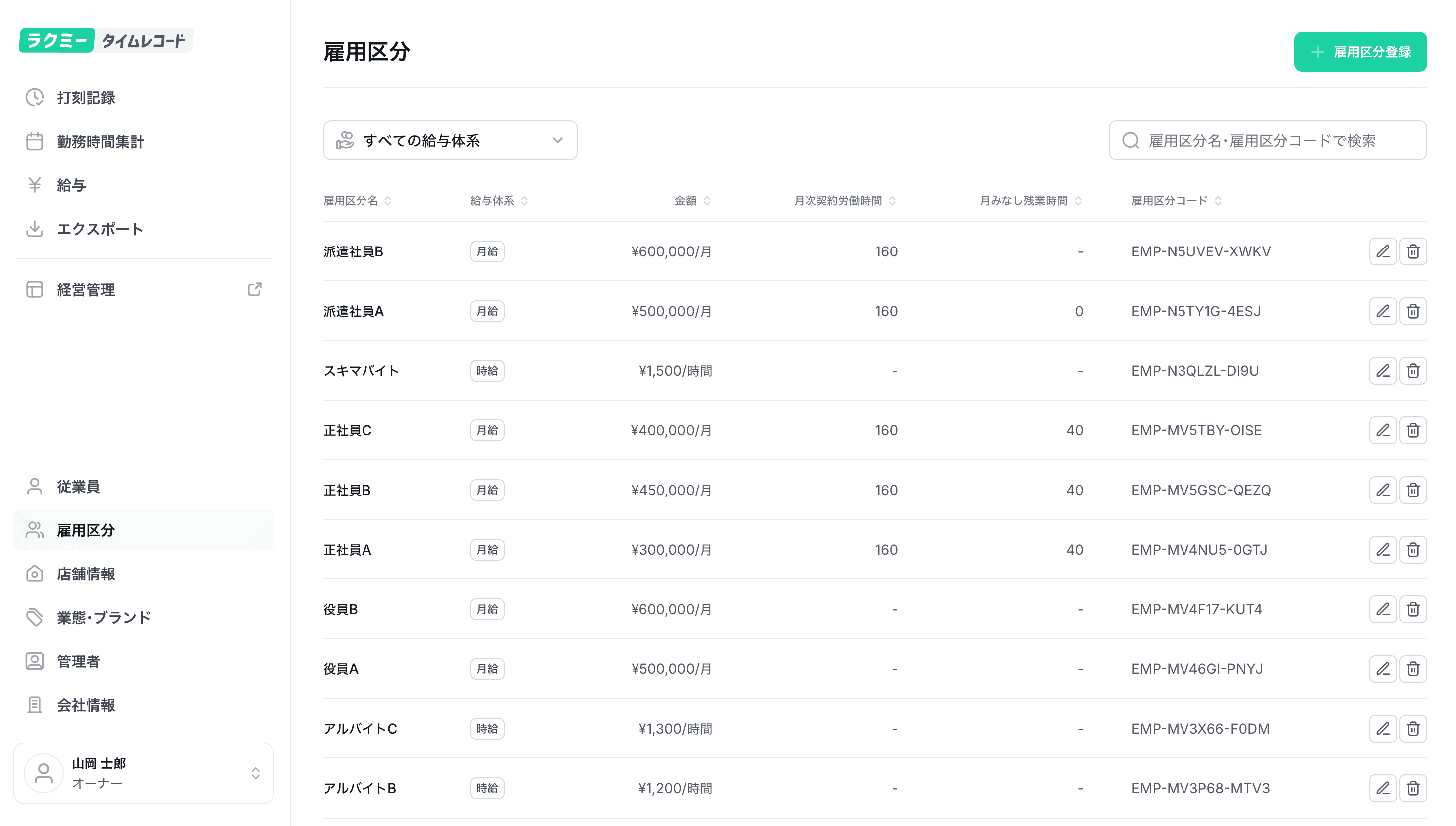 雇用区分ページにて、雇用区分名の行の右端の🗑️アイコンをクリックし、雇用区分を削除