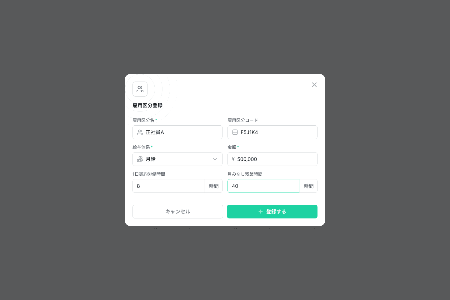 雇用区分ページにて、「雇用区分登録」ボタンをクリックし、雇用区分情報を登録 (雇用区分コードは入力しない場合、自動生成されます)