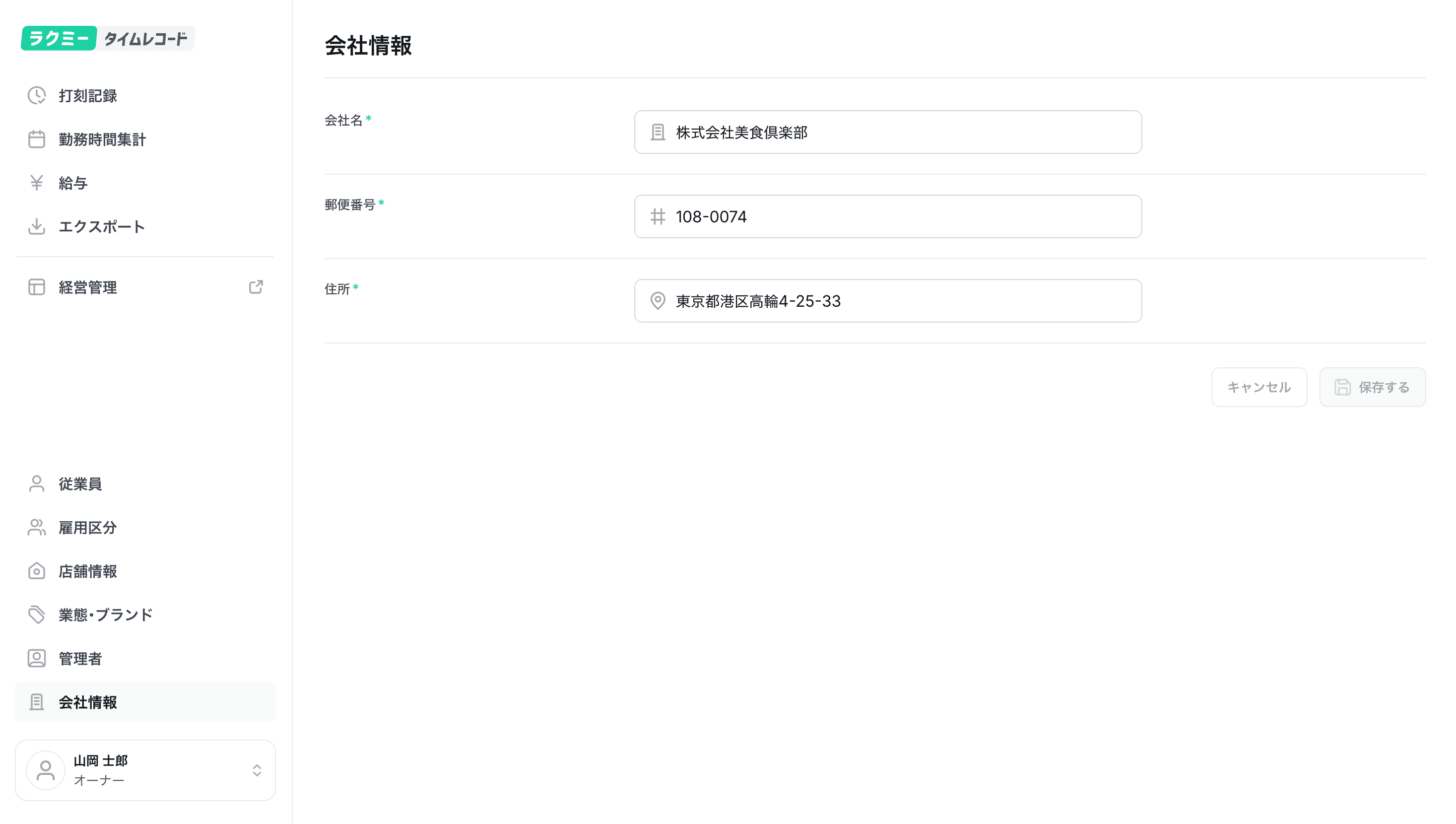 ナビゲーションメニューから「会社情報」を選択し、会社名、郵便番号、住所を登録します